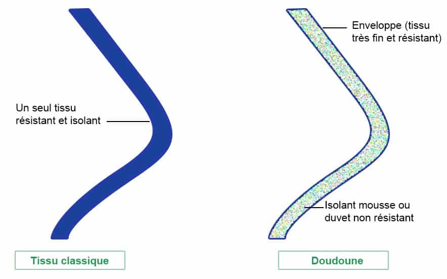 La doudoune est différente des autres vêtements thermiques car elle est faite d’un tissu « enveloppe » rembourré avec isolation.